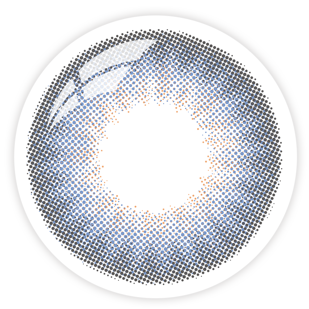 Tri-tone dots mimic the ripple of water with hues gradient inward. Reflect against Asian iris, the Gloss color lenses present 3-dimentional gentle and soulful eyes with a dark shade on the limbal ring.